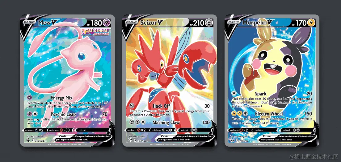 10、pokemon-cards-css:炫酷的神奇宝贝卡牌 CSS 效果。该项目是口袋怪兽卡高级 CSS 样式集合,使用了 3D 变换、滤镜、渐变等技术,实现了眩光、纹理、银河全息、垂直光束等效果。