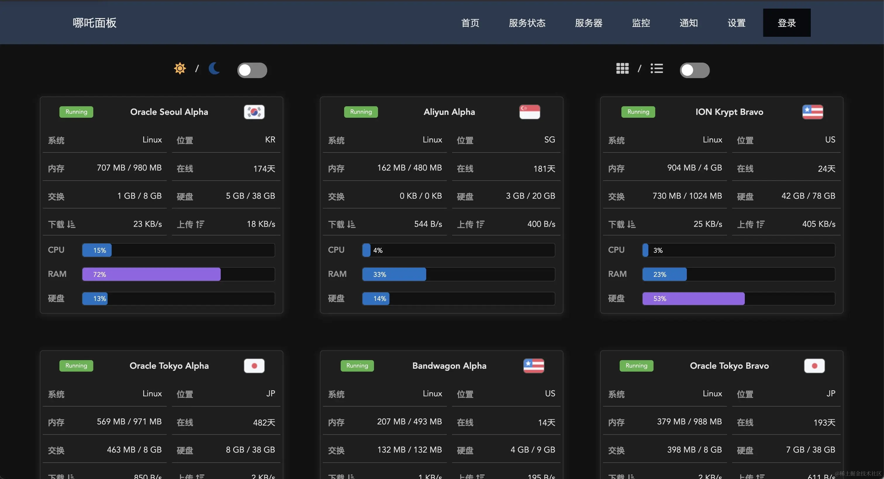 13、nezha:国产的轻量级服务器监控工具。这是一款名为“哪吒”的服务器监控面板,它安装简单、开箱即用,支持监控多个服务器的系统状态、SSL 证书状态、报警通知、流量监控、设置定时任务等功能,适用于 Linux、Windows、macOS、OpenWRT 等主流系统。来自 @两双筷子sqldc 的分享