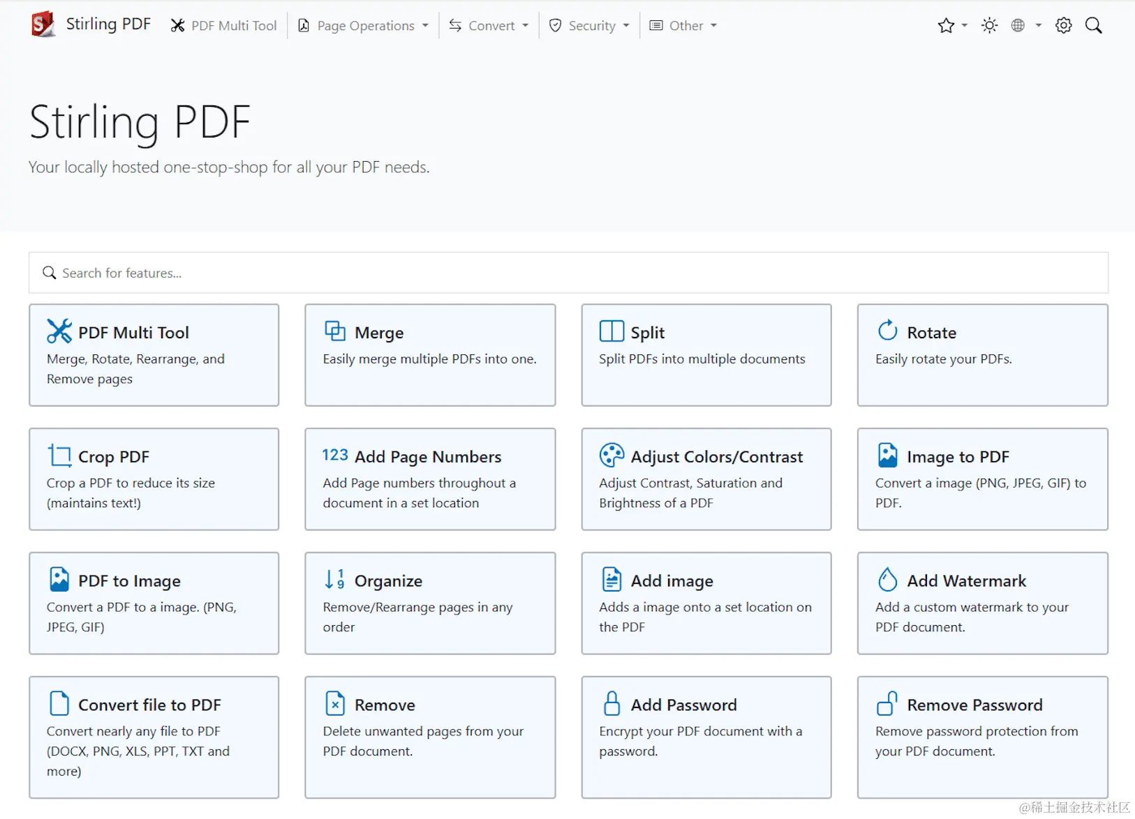 16、Stirling-PDF:允许对 PDF 文件做各种操作的 Web 应用。这是一款功能强大、开箱即用的 PDF 工具,支持拆分/合并文件、添加/提取图片、压缩、加水印、添加/删除密码等功能,满足你对 PDF 文件的所有需求。