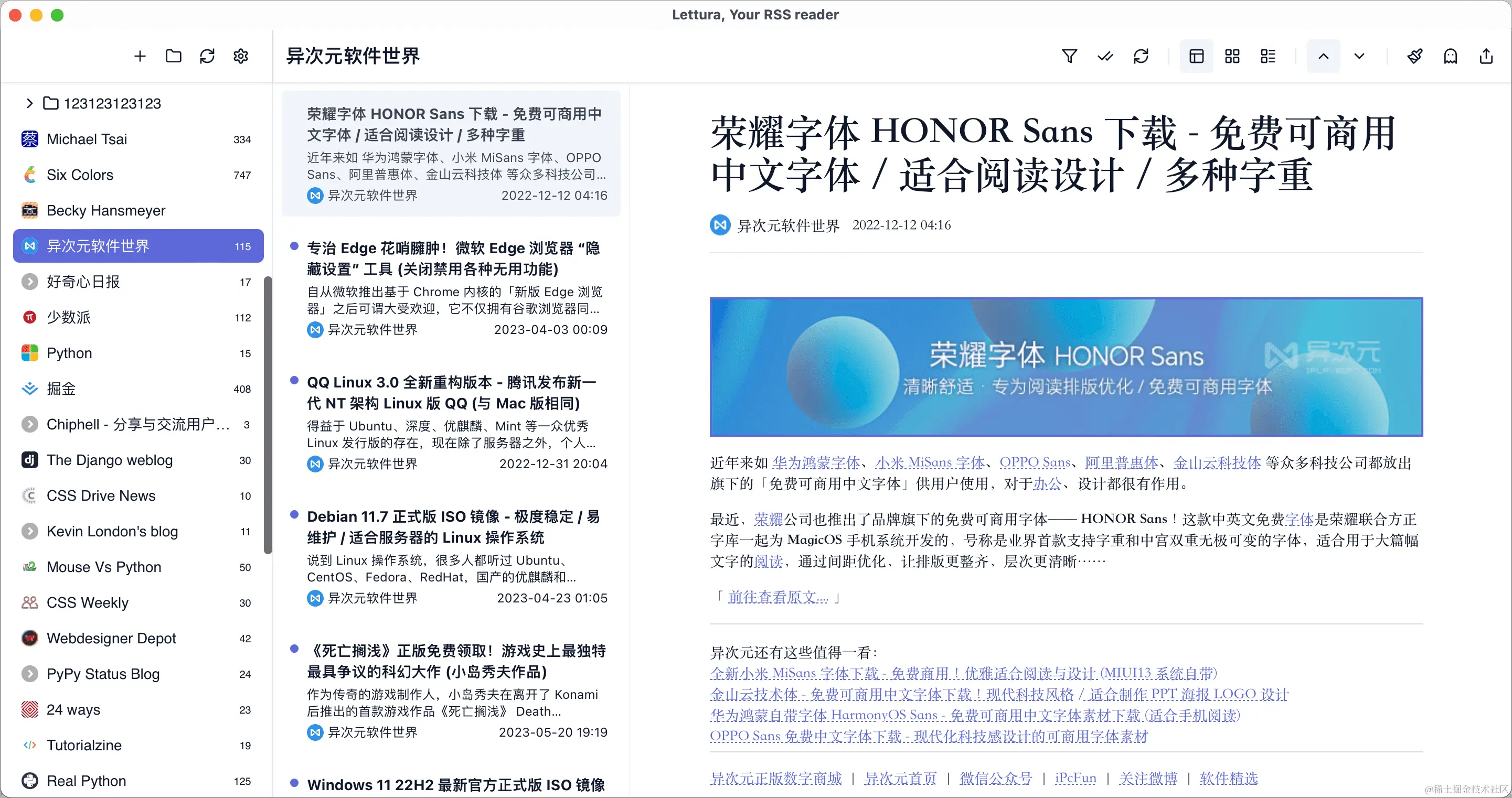 29、lettura:极简的开源 RSS 阅读器。这是一款基于 Tauri 开发的桌面 RSS 阅读器,它免费、无广告、界面清爽,适用于 macOS 和 Windows 操作系统。