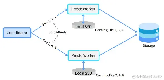 上图展示了软亲和力节点选择架构。软关联调度尝试根据文件路径向工作程序发送请求,通过在工作程序缓存中定位数据来最大化缓存命中率。软亲和力之所以是“软”,是因为它不是一个严格的规则——如果首选工作人员繁忙,则将分片发送到另一个可用工作人员而不是等待。