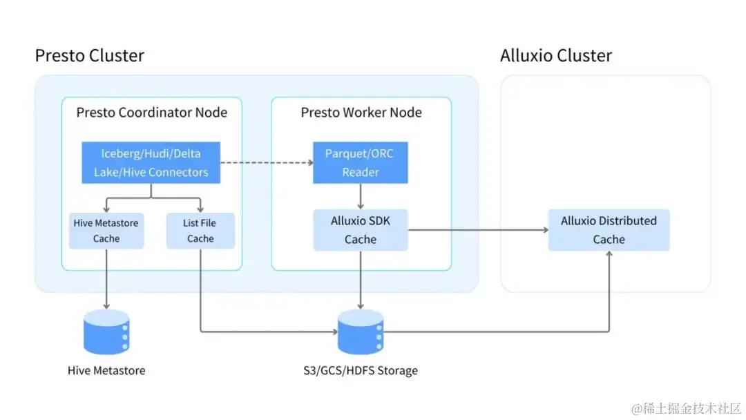 | Alluxio SDK缓存 | Presto工作节点 | 内存/SSD |