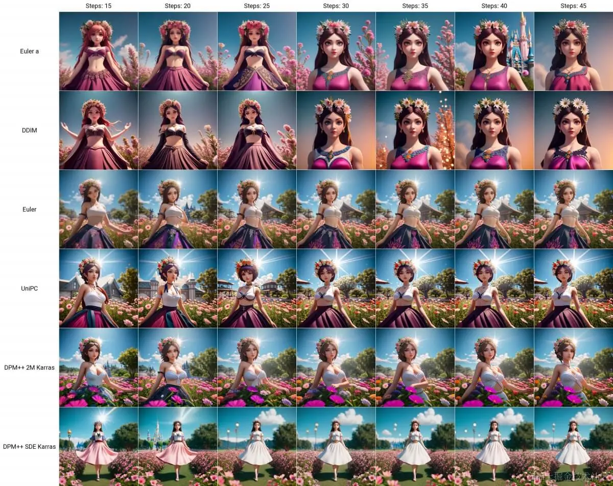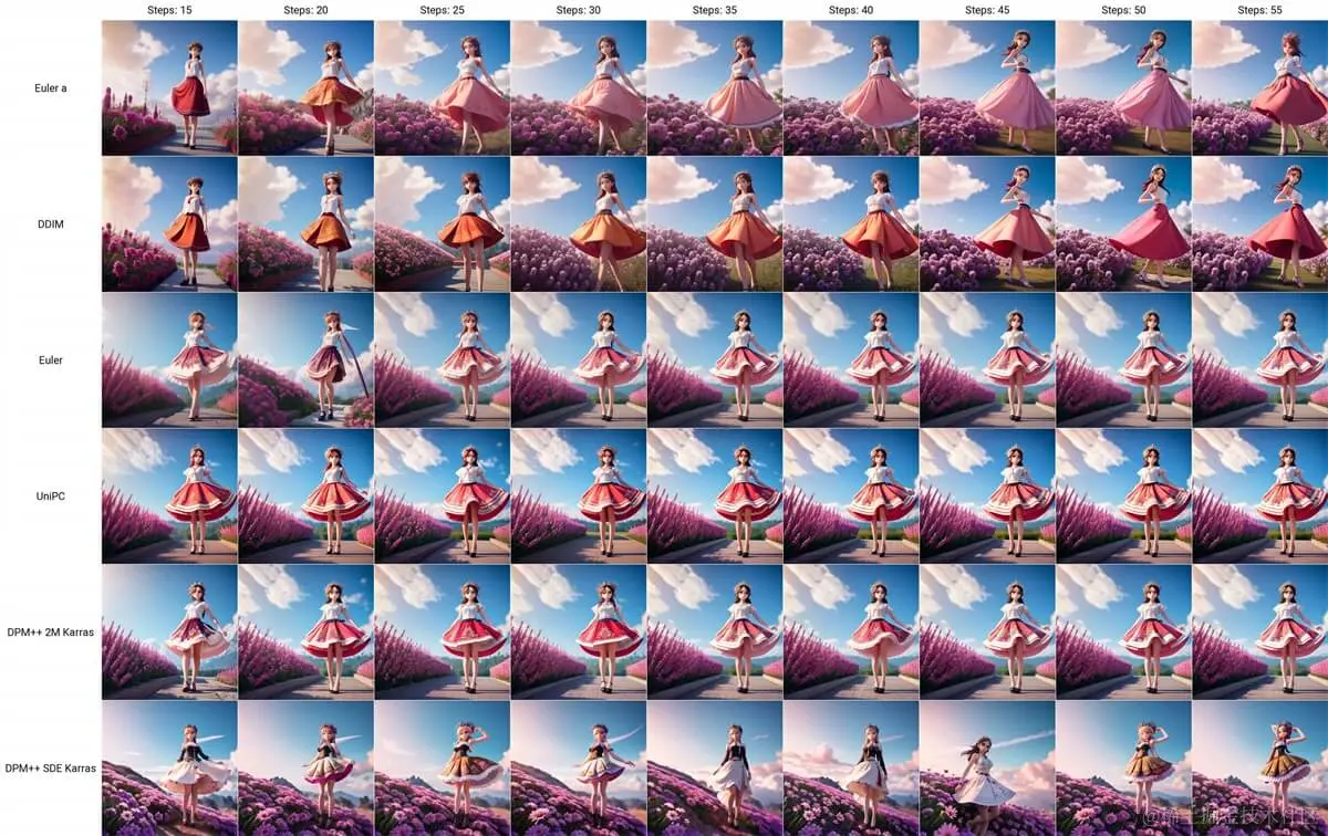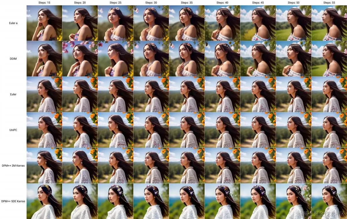 可以看到,Euler, UniPC,DPM++ 2M Karras 出图是比较稳定的,在更高的步数下得出的结果跟低步数差别不大,只是更精细。