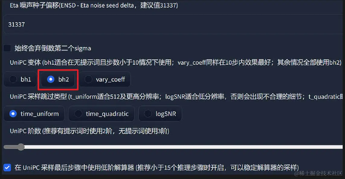 需要在设置->采样器参数,中另外使用 UniPC 采样器将 UniPC 变体改为 bh2