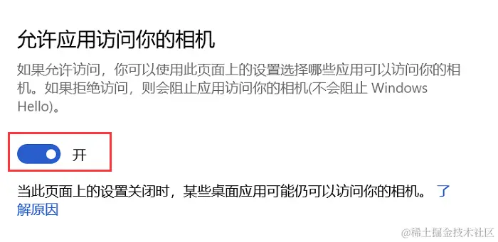 3.在 【允许应用访问您的摄像头】下,确保开关处于【打开】状态;