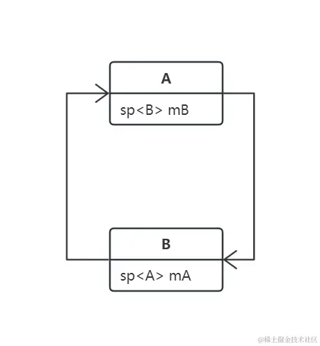 // 随着 A 的析构, A 的成员变量 mB 也开始析构, 目标对象 B 强弱引用计数减 1,内部强弱计数值变为 (0,0),回收目标对象 B 以及内部管理对象,B 对象的内存回收工作完成,接着触发 B 对象的成员 mA 的析构函数