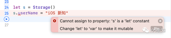 想要修复这个报错,就需要用 nonmutating 关键字了,只需要在 set 方法前加上这个关键字,就可以正常运行了。