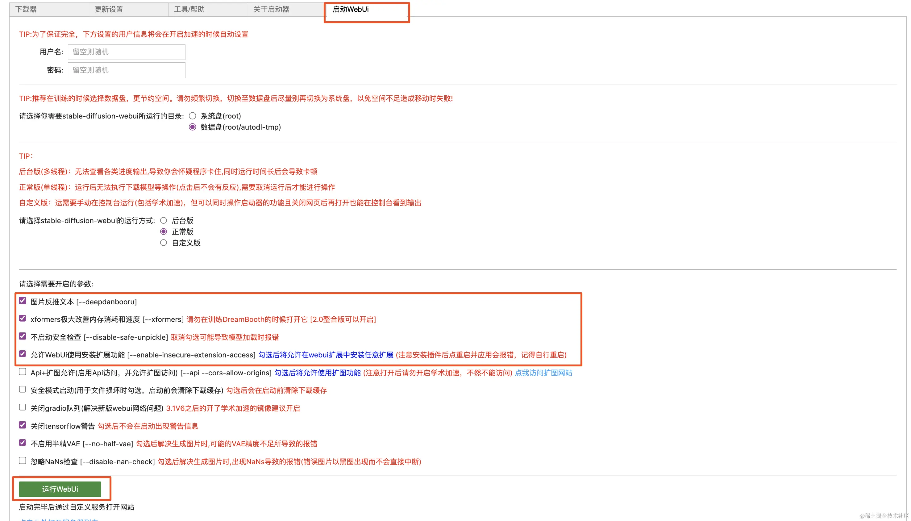 11、选择“启动WebUi”,然后勾选前4个常用功能,点击运行WebUi,等待代码运行