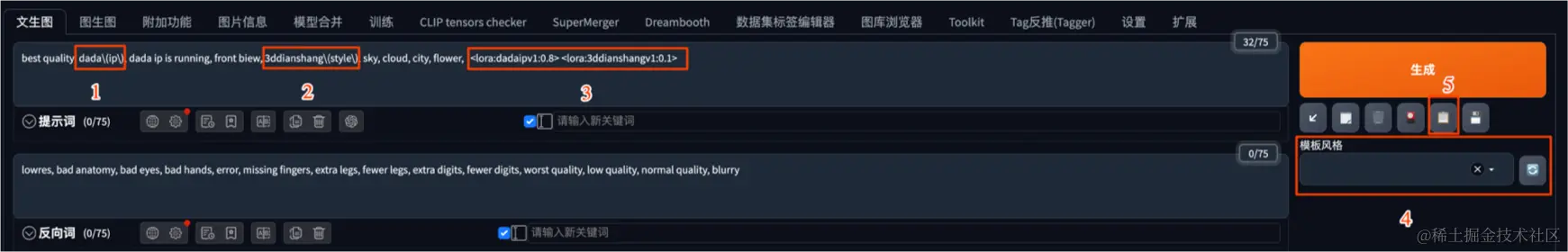 · 正向词:会出现3种类型:触发词+提示词+LoRA,越靠前的词汇权重就会越高