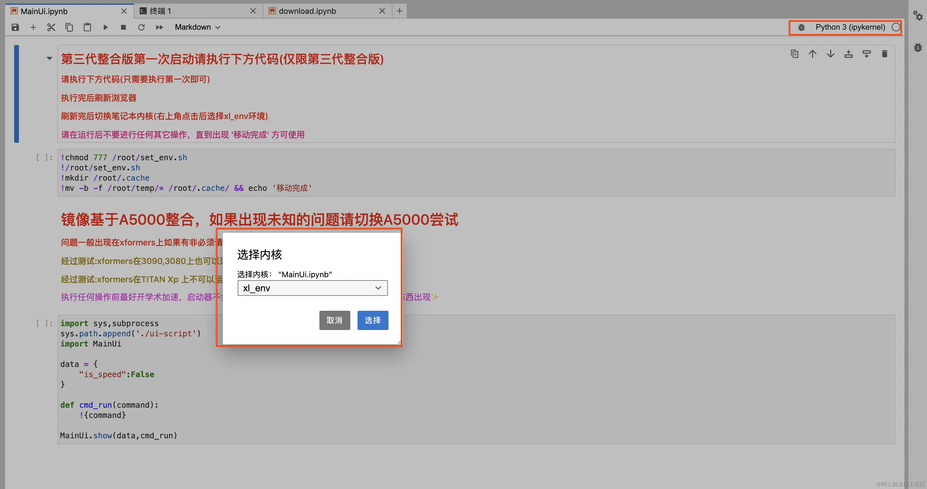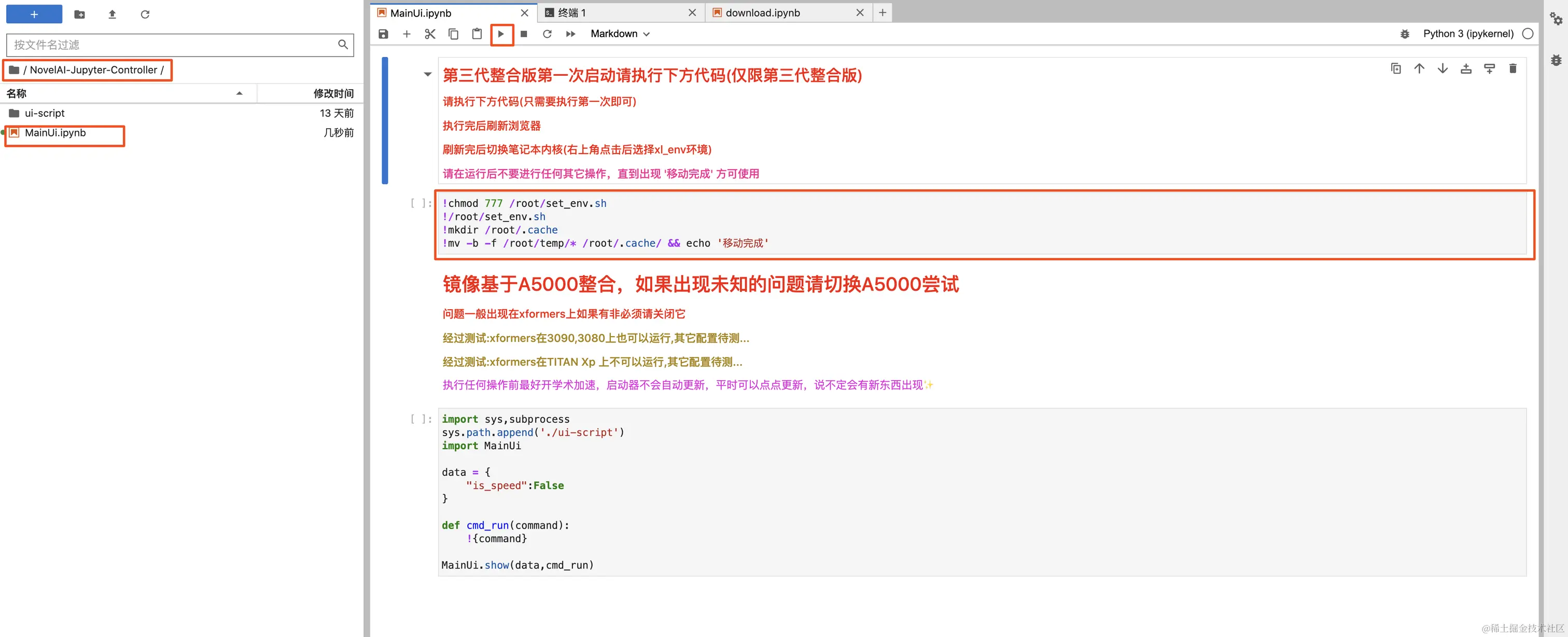 8、左侧目录下,打开MainUI.ipynb,点击第一行代码区域,然后点击上方的“运行”三角,显示“移动完成”后刷新页面