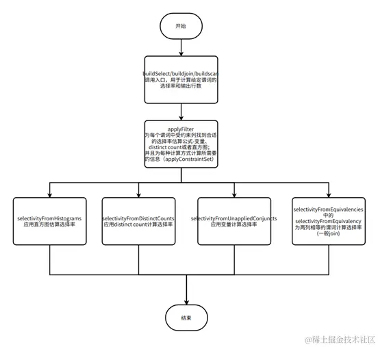 主要流程:当一个过滤条件输入进来时,根据其谓词表达式判断对应的列适用于哪些过滤率的计算方式,然后根据收集到的统计信息与计算方式相结合,得到最终的过滤率。