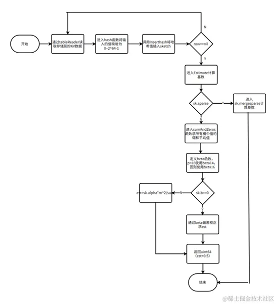 HyperLogLog 是 KaiwuDB 统计信息中计算 Distinct 值的主要估计算法。下图为详细流程: