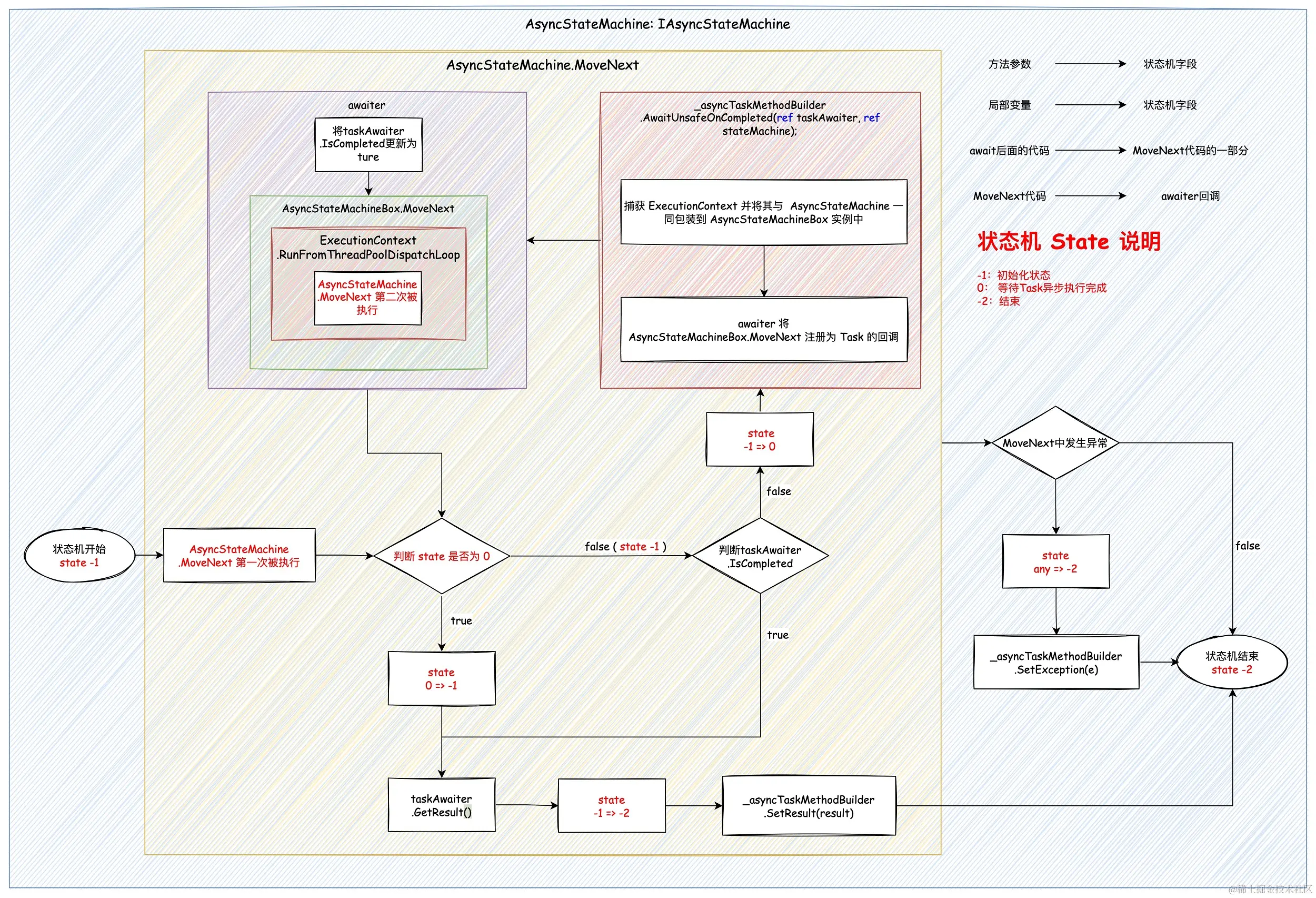 - 状态机:由编译器生成,每个 async 方法 有且仅有一个,await 后面的代码会被编译到 状态机 的 MoveNext 方法中,注册为 Task 的回调。