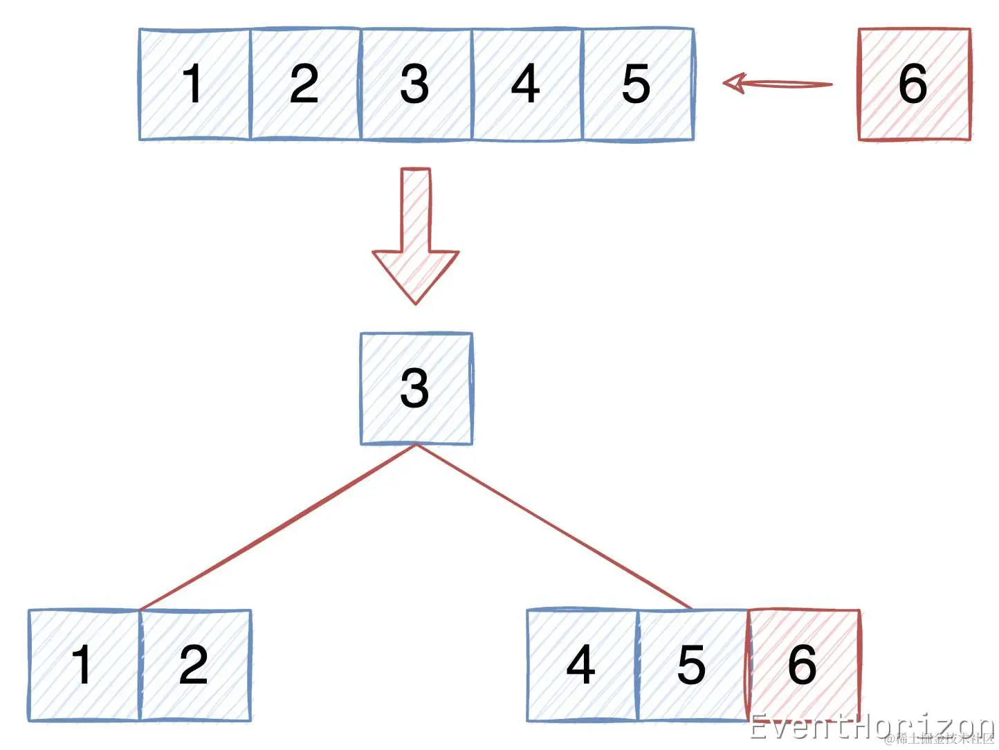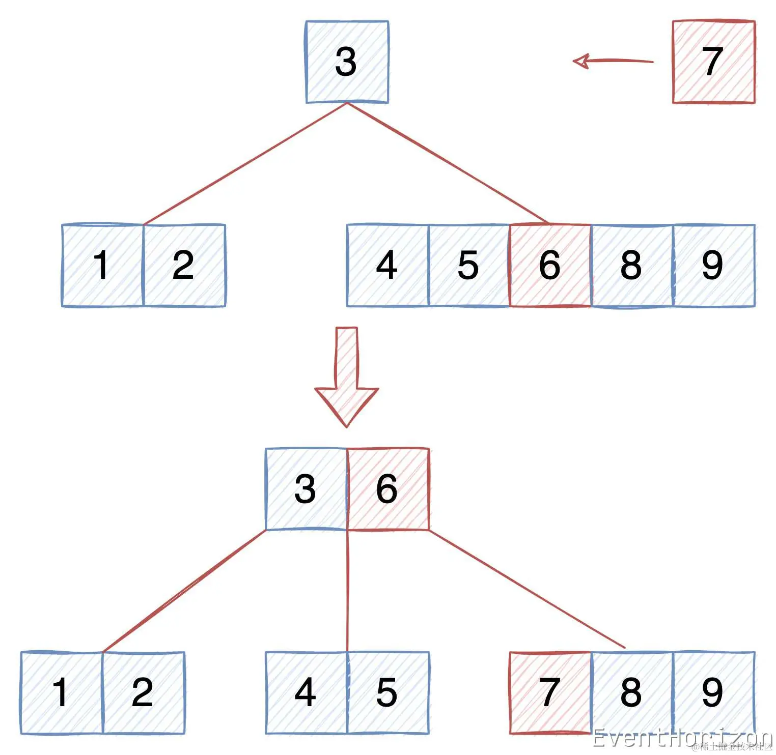 这5个属性都是为了维持B树的平衡。其中前5个是在 度 被定义后就可以控制的,而第6个是源于B树新增数据的方式,稍后会做解释。