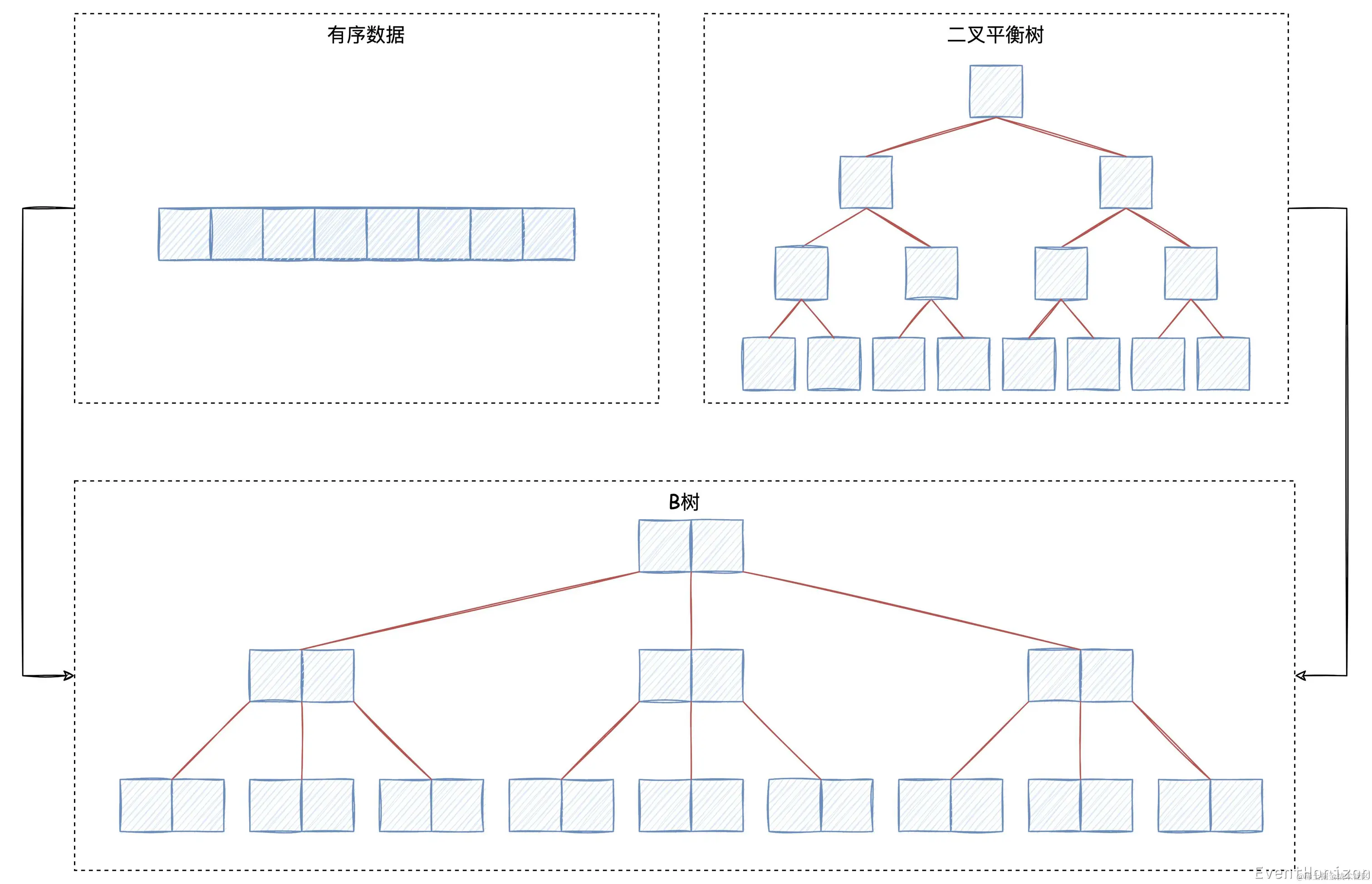 但二叉平衡树的局部性很差,这在内存中不是什么问题,因为内存访问随机数据的性能很高,但在磁盘中,不断加载不同的磁盘页,overhead 很高。