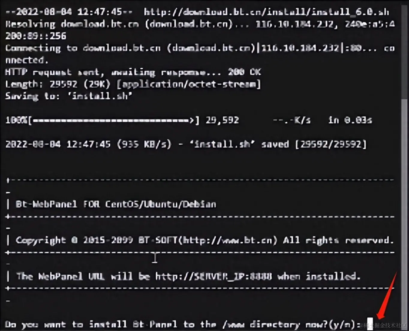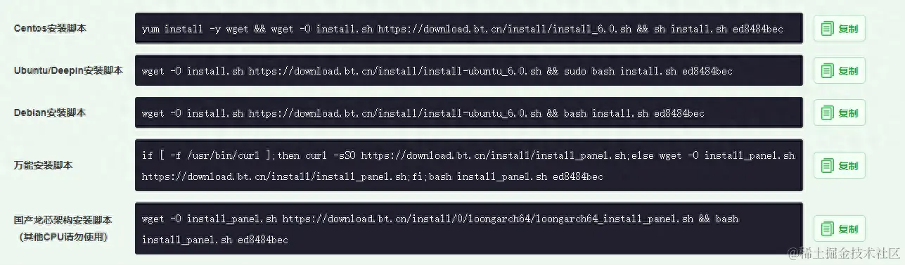 1.首先我们连接上自己的服务器,然后去宝塔官网复制安装脚本,这里需要注意找到与你服务器相对应的脚本。