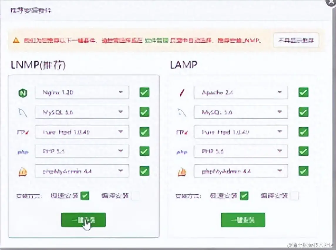 进入宝塔需要绑定你的宝塔账号,进入之后在弹出的推荐中选择第一个,这也是网站运行的基础环境软件。