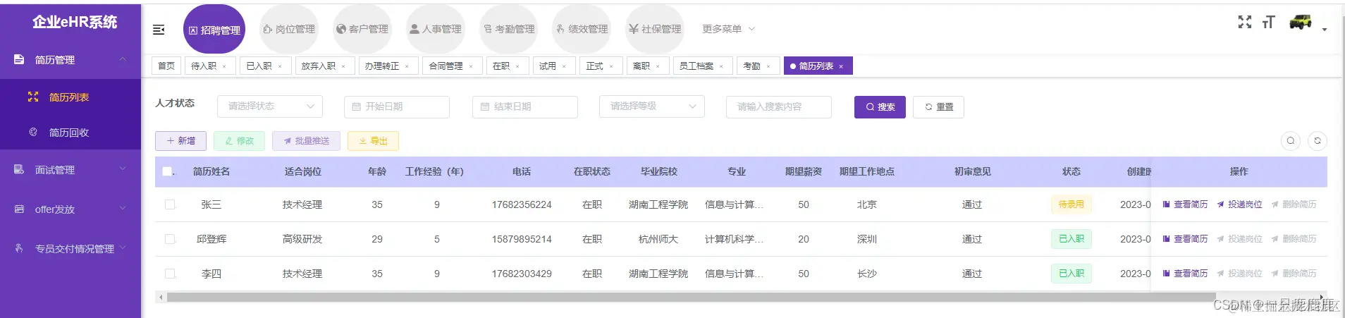 系统介绍: 1、招聘管理是企业引进人才的重要环节,其主要目的是为企业寻找合适的优秀人才,提高人才储备,进而提升企业的综合竞争力。在招聘过程中,企业通常会选择多种渠道发布招聘信息,如招聘网站、社交媒体、校园招聘等,以吸引更多的优秀人才。同时,企业还需根据自身情况和招聘岗位制定合理的招聘标准,确保招聘工作的有效性和准确性。