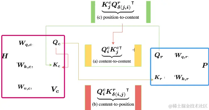 左边紫色框中的是传统注意力中的Q、K、V,即内容相关的;右面蓝色框中是位置相关的: