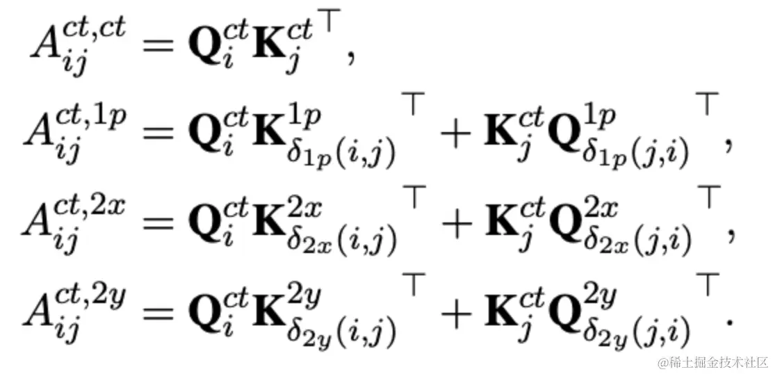在looking up embedding表之后,一系列投影矩阵将这些相对位置向量以及内容向量映射为 Q K V,注意力解耦为四个部分: