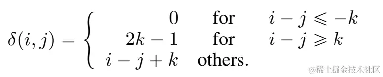 这里的P是一个相对位置编码矩阵,这里的2k是怎么来的呢,假设 k 是最大相对距离,δ(i,j) 是 token i 到 j 的相对位置,定义如下,k默认是 512,也就是说相对距离的范围从 -512 到 512, P就是将i和j之间的相对位置(数字)映射成为d维的向量。