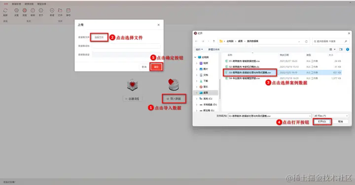 进入工程主页之后,点击“导入数据”,即跳出数据集文件上传窗口。点击窗口中的“选择文件”按钮,即可选择本地磁盘中的数据文件加载至当前项目中,如图3所示。