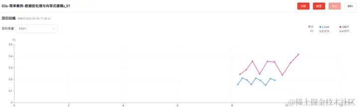 模型训练完成之后,向导式建模会以图表的形式向用户展示模型的评价指标。如图18展示了EQV1目标变量的建模评价结果,线性回归模型的R2指标在0.2左右,而GBDT模型的R2指标在0.4左右,说明适合用非线性模型建立EQV1目标变量和输入变量之间的映射关系。