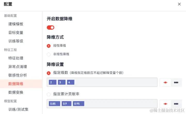 数据降维是特征选择后对输入数据的进一步压缩提纯,如图14所示,本案例开启数据降维后选择线性降维的方法,并指定累计贡献率作为降维的标准,对输入特征进行压缩。