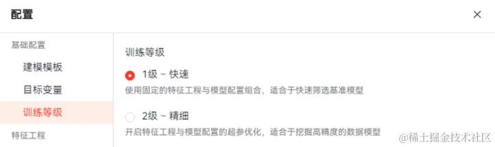 基础配置包括建模模板、目标变量和训练等级三部分。其中建模模板为向导式建模入口配置时所设定,在设置目标变量时可以添加新的变量或删除已设置的变量。并且向导式建模提供了两个训练等级,为方便起见,本案例中选择快速的模型训练方式。
