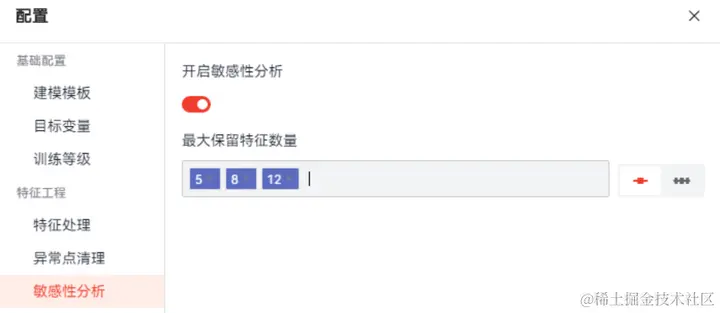 敏感性分析可使用户选择对目标变量重要性最大的若干个特征进行后续的建模,如图13所示,本案例中选择了重要性最大的5个、8个和12个特征。
