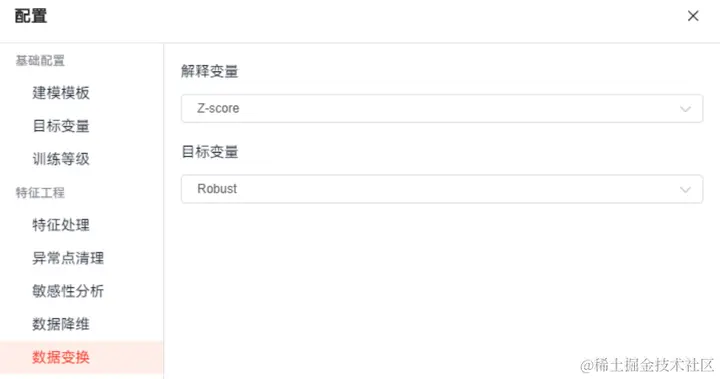 数据降维后可进行数据变换的配置,如图15所示,本案例分别对输入变量和输出变量进行Z-score和Robust变换。