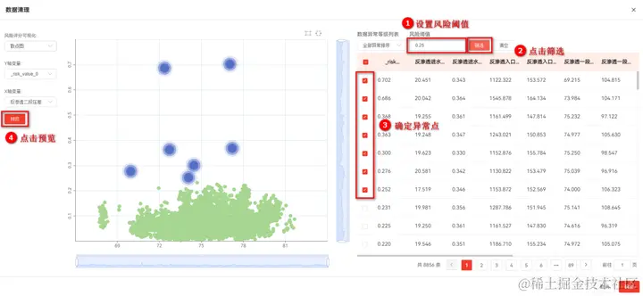 点击开始,在跳出配置弹窗中,左侧散点图绘制窗口的Y轴变量选择“_risk_scores”,X轴变量选择“反渗透二段压差”,即可观察对应异常值的分布情况。在右侧表格中,设置风险阈值为0.25并点击筛选按钮,即可自动选中下方表格中_risk_scores_大于0.25的样本。点击预览可观察异常样本的分布。最后点击右下角提交后完成异常点清理,如图11所示。