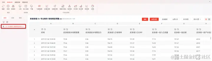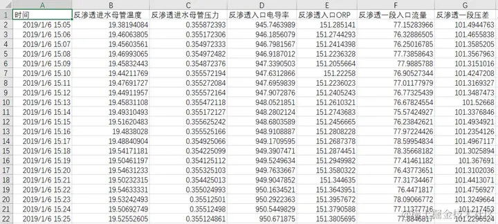 在本节中,将介绍DTEmpower在实际工程案例中的具体应用。该案例来源于某电厂化学水处理系统反渗透过程,反渗透是采用膜法液体分离技术,利用膜两侧的压力差为动力,使溶液中的溶剂透过反渗透膜分离出来。本案例利用反渗透进水母管压力、一段入口流量、一段压差、一段产水流量、一段浓水流量等参数训练得出反渗透二段压差智能预警模型。其部分算例数据如图1所示。