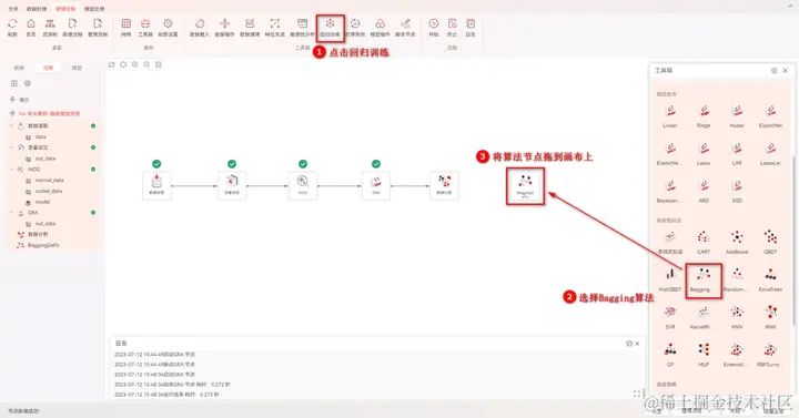 将工具箱切换至回归训练,从中将BaggingDeFo节点拖拽至画布中,并连接数据分割节点,如图16所示。