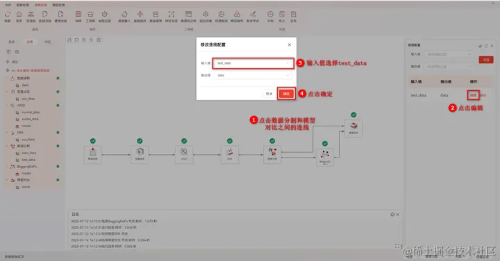 点击数据分割与模型对比之间的连线,在连线配置窗口中选择编辑,将输入值改为test_data并点击确定,如图19所示。