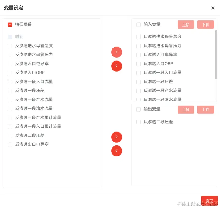 点击开始,当流程运行至变量设定节点时,在弹出配置窗口中将“反渗透二段压差”选为输出变量,其余(除时间)变量选为输入变量,如图9所示。
