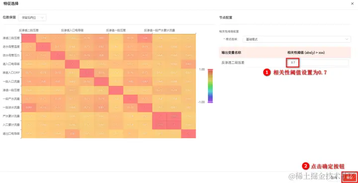 点击开始,在跳出配置弹窗中,将反渗透二段压差的相关性阈值设为0.7,并点击确定,如图13所示。