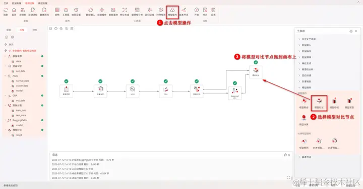 将工具箱切换至模型操作,从中将模型对比节点拖拽至画布中,并同时连接数据分割与BaggingDeFo节点,如图18所示。