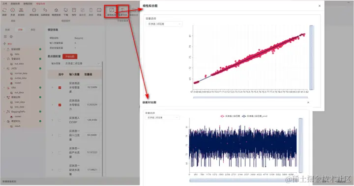 在BaggingDeFo节点配置中,开启交叉验证。点击开始,模型训练结束后,可在左侧资源树中查看模型详细信息。点击顶部菜单栏模型处理中的线性拟合或误差对比等,可观察模型训练效果,如图17所示。