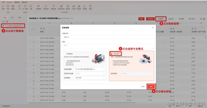 上传数据集之后,单击选中数据集,在数据集的右上方,点击选择“数据建模”,会即弹出数据建模的两种模式选择,点击选择专业模式,如图6所示。这里可以根据用户自身需求更改流程名称和描述(非必须操作),然后点击确定按钮。