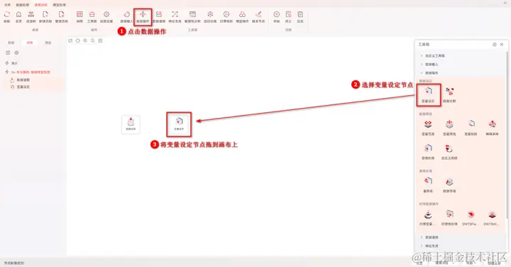 将工具箱切换至数据操作,从中将变量设定节点拖拽至画布中,并连接数据读取节点,如图8所示。