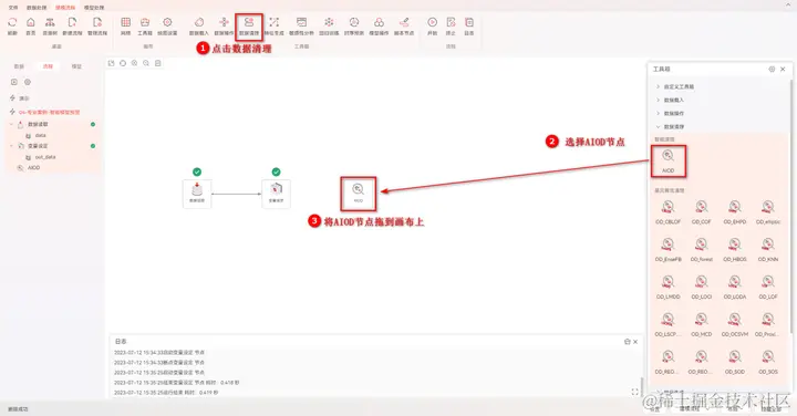 将工具箱切换至数据清理,从中将AIOD节点拖拽至画布中,并连接变量设定节点,如图10所示。