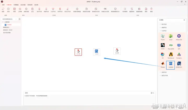 CAESES为可执行程序,因此,需要从工具栏中拖拽一个CAESES节点加入画布,如图 4所示。
