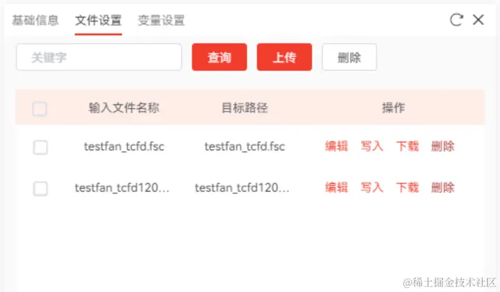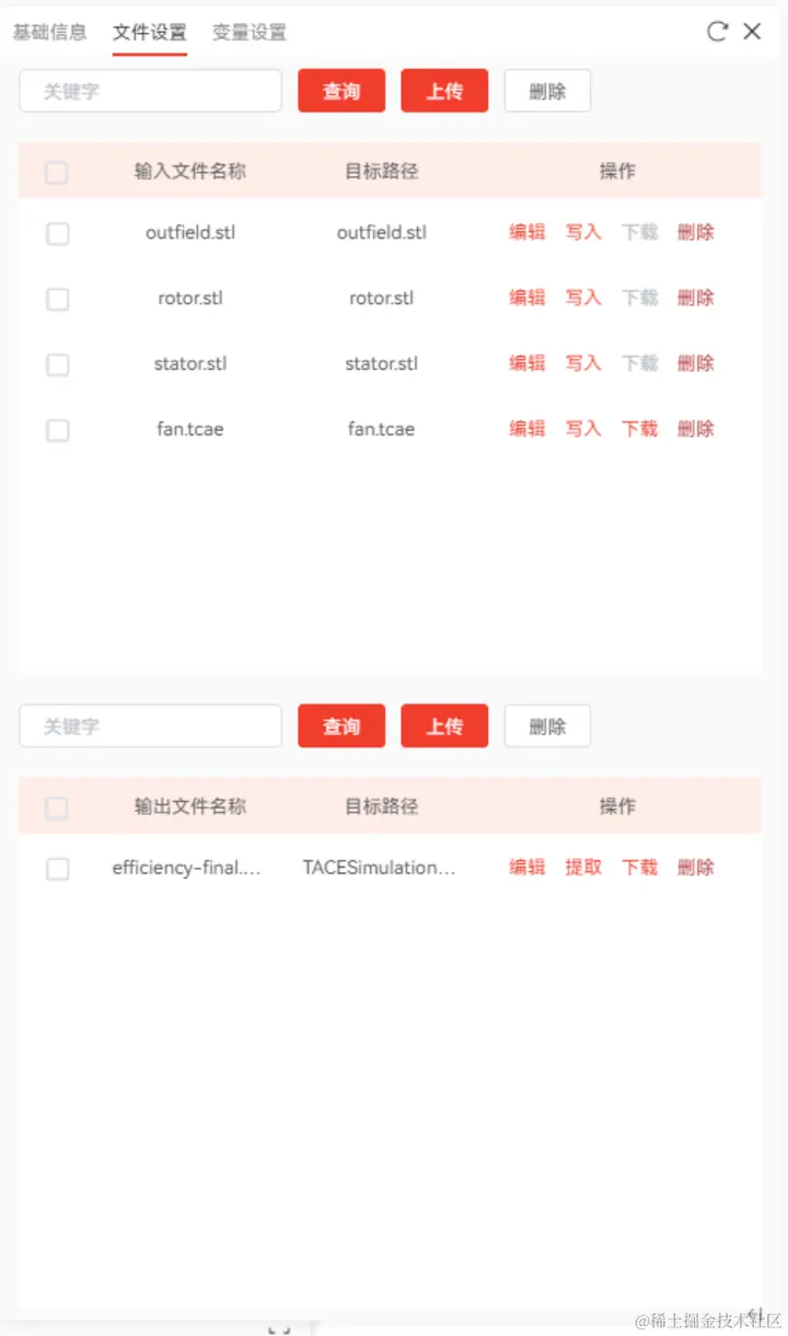 单击输出文件列表中【上传】按钮,上传efficiency-final.csv文件,即可完成TCAE节点输出文件的配置,因为TCAE输出文件存储不在工程根目录下,因此需要单击其后方的“编辑”按钮,将目标路径修改为相对于工程文件夹的存储路径,如图15所示,最终TCAE节点的文件配置如图16所示。