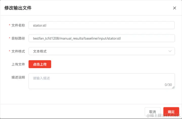 在输出文件列表上方单击上传按钮,在弹出窗口中选择三个stl文件后单击打开按钮即可完成输出文件的新建。由图2可知,rotor.stl、stator.stl、outfield.stl文件存储位置不在工程根目录下,因此需要单击其后方的【编辑】按钮,将目标路径修改为相对于工程文件夹的存储路径,如图8所示。