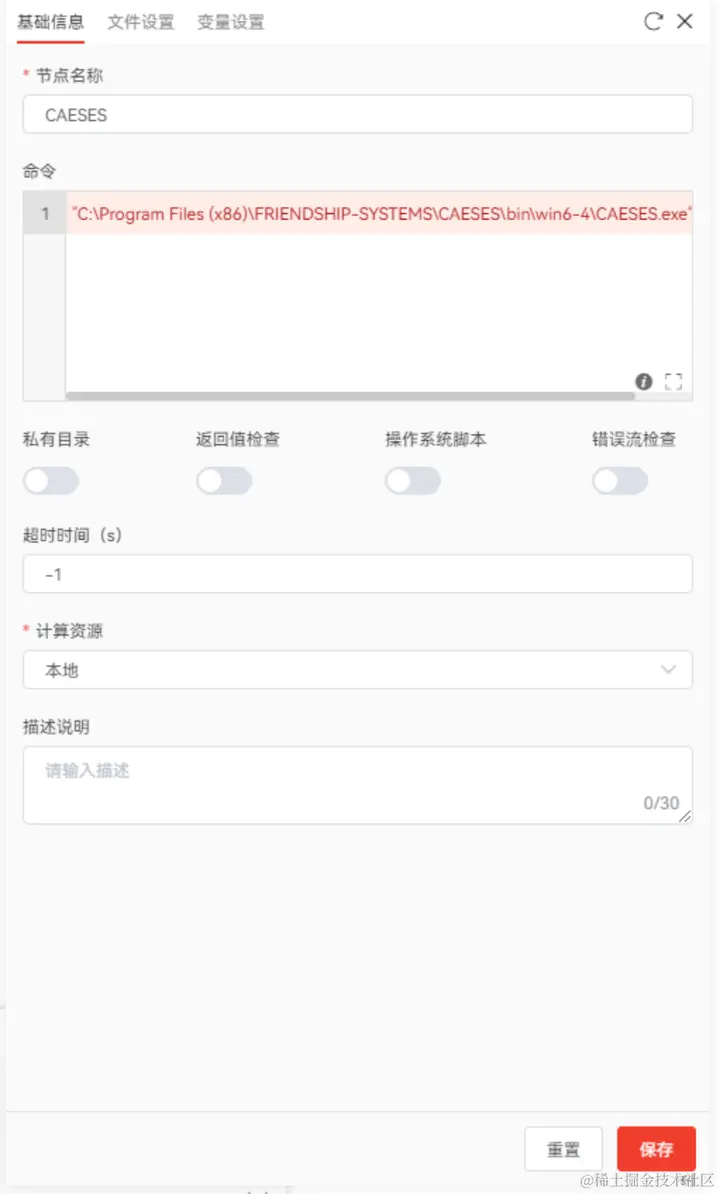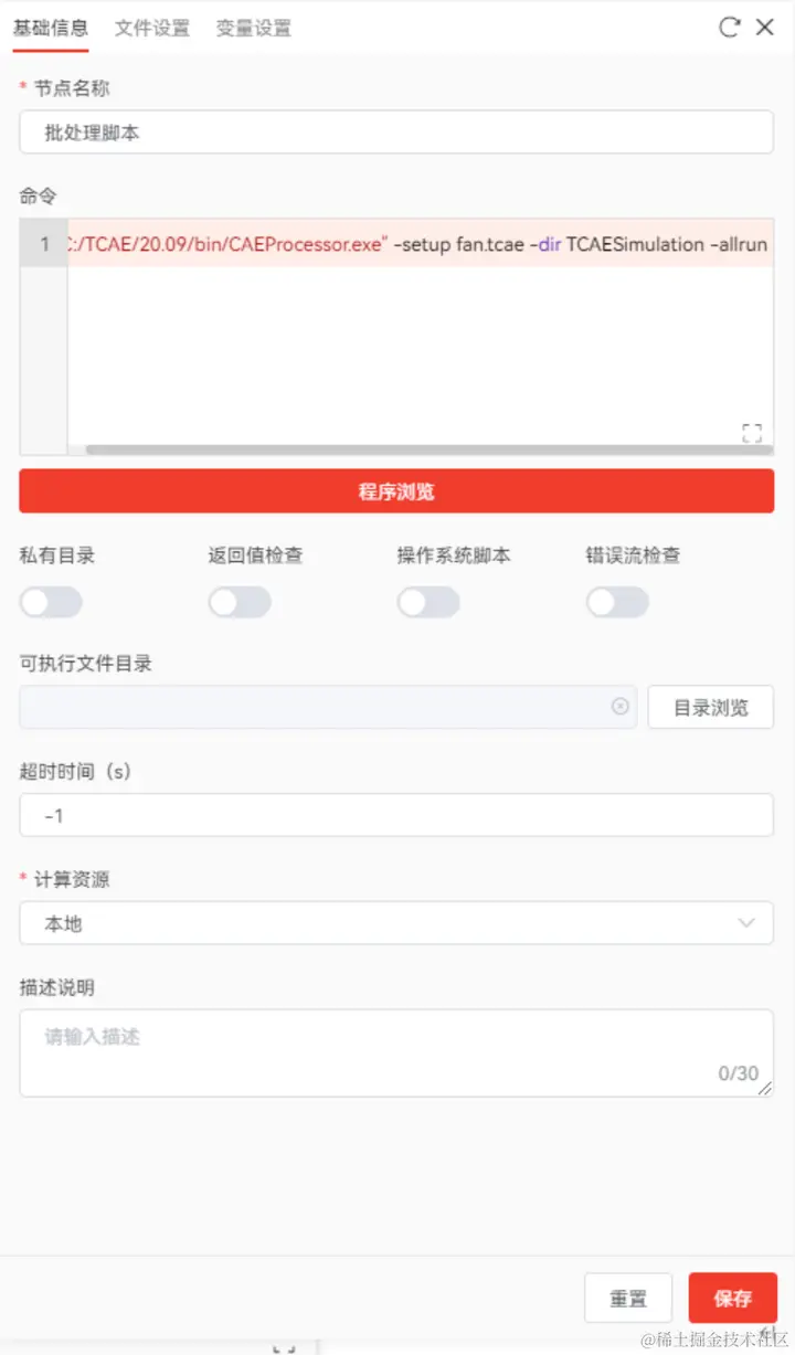 单击新加入画布的TCAE调用节点后,可在弹出窗口中对TCAE节点的信息进行配置,如图12所示,其中命令即调用TCAE的批处理命令。