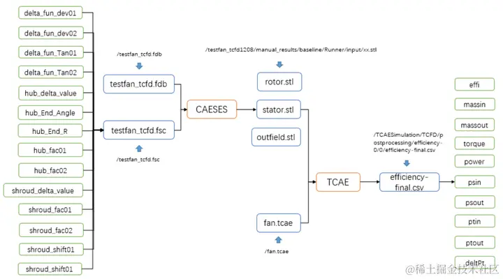 计算流程开始执行时需要传入delta_fun_dev01、delta_fun_dev02、delta_fun_Tan01、delta_fun_Tan02、hub_delta_value、hub_End_Angle、hub_End_R、hub_fac01、hub_fac02、shroud_delta_value、shroud_fac01、shroud_fac02、shroud_shift01、shroud_shift02这14个模型参数,因此,14个模型参数是整个计算流程的输入变量。