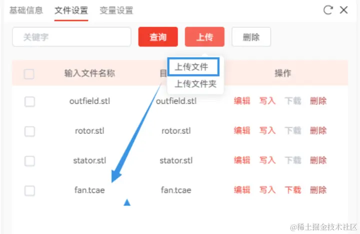 如图2所示,CAESES节点包含两个输入文件testfan_tcfd.fsc和testfan_tcfd1208.fdb;三个输出文件outfield.stl、rotor.stl和stator.stl。选择CAESES节点配置弹窗中的文件设置选项,即可对CAESES节点的输入输出文件进行配置。首先鼠标移至输入文件列表上方【上传】按钮处,在展开下拉列表中选择【上传文件】选项,在弹出窗口中选择对应的文件后单击打开按钮即可完成输入文件的新建,如图6所示。