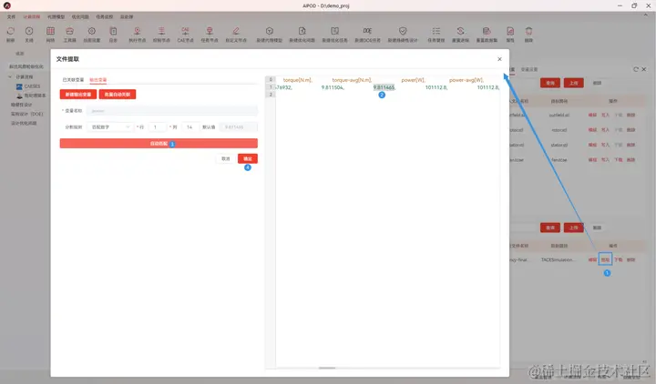 由图2可知,TCAE的变量包含从文件中提取的9输出变量,因此,在文件设置选项下,单击输出文件efficiency-final.csv后方的“提取”按钮,单击新建变量,依次填写输出变量名称,指定输出变量在文件中的读取位置后,单击确定即可在添加输出变量的同时完成输出变量与输出变量的关联。需要注意的是,变量在文件中的行列编号均从0开始,若不清楚其位置,可在左侧文件中选中对应位置,单击“位置解析”按钮,实现读取位置的自动匹配如图17所示。