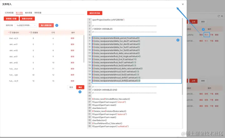 如图2所示,调用CAESES节点时,14个输入变量的值需要被写入fsc文件中的固定位置,以实现新设计方案的生成,因此需要将14个输入变量与fsc文件关联。回到CAESES节点【文件设置】选项下,单击fsc文件后方的【写入】按钮,在弹出窗口右侧文件内容中选择需要进行变量识别与写入的位置,然后单击左侧【自动提取输入变量】按钮,确认识别到的变量无误后,单击【确定】按钮,即可实现输入变量新建并且与fsc文件进行写入关联,如图9所示。